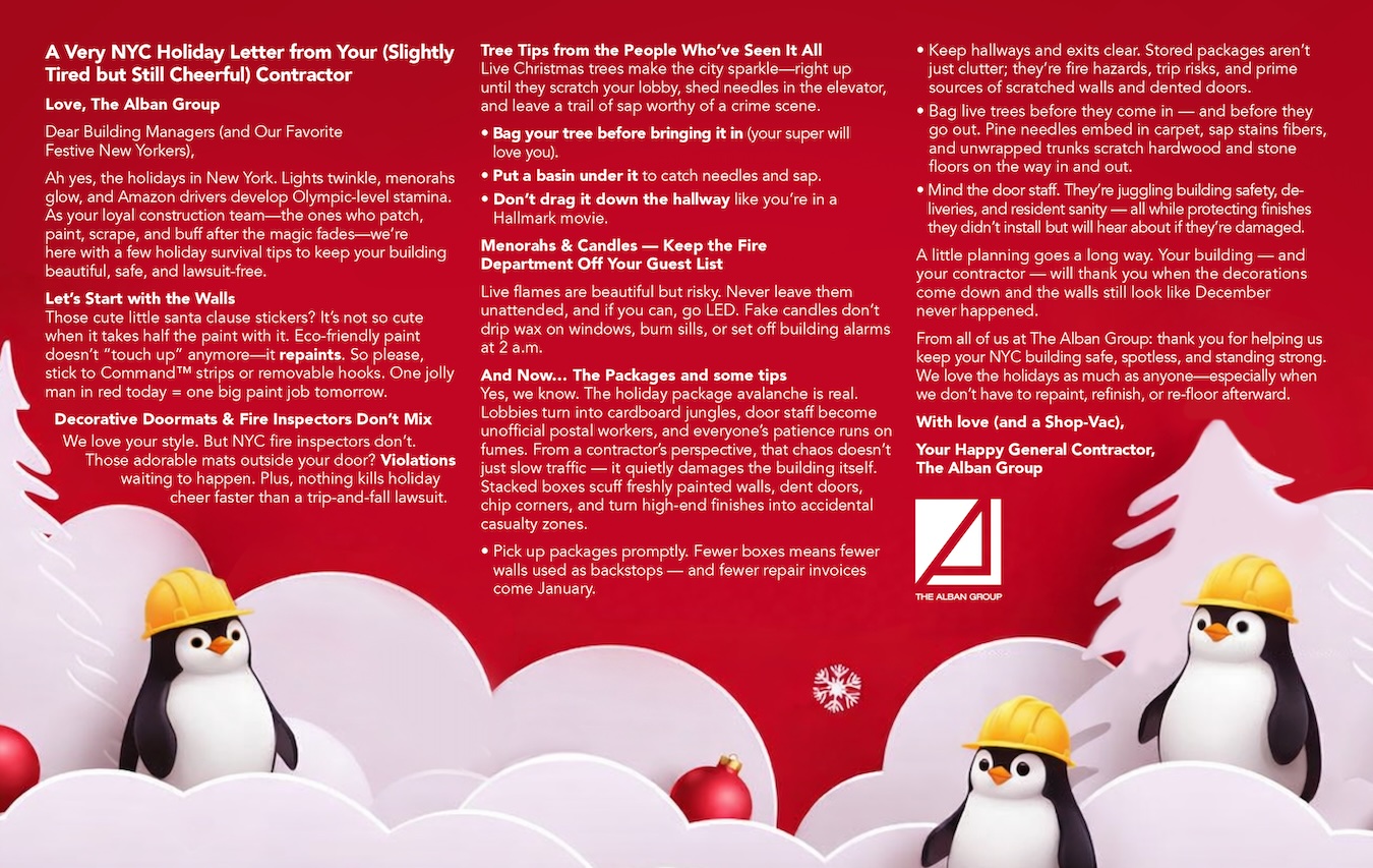 Love, The Alban Group Dear Building Managers (and Our Favorite Festive New Yorkers), Ah yes, the holidays in New York. Lights twinkle, menorahs glow, and Amazon drivers develop Olympic-level stamina. As your loyal construction team—the ones who patch, paint, scrape, and buff after the magic fades—we’re here with a few […]